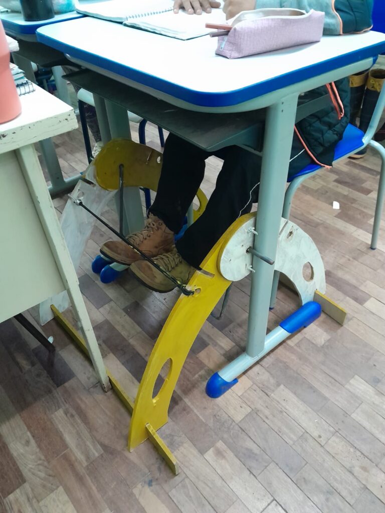 O dispositivo consiste em um apoio móvel instalado sob a mesa do aluno, permitindo o movimento dos pés. A proposta é ajudar na autorregulação, melhorar a concentração e reduzir a inquietação em sala de aula.